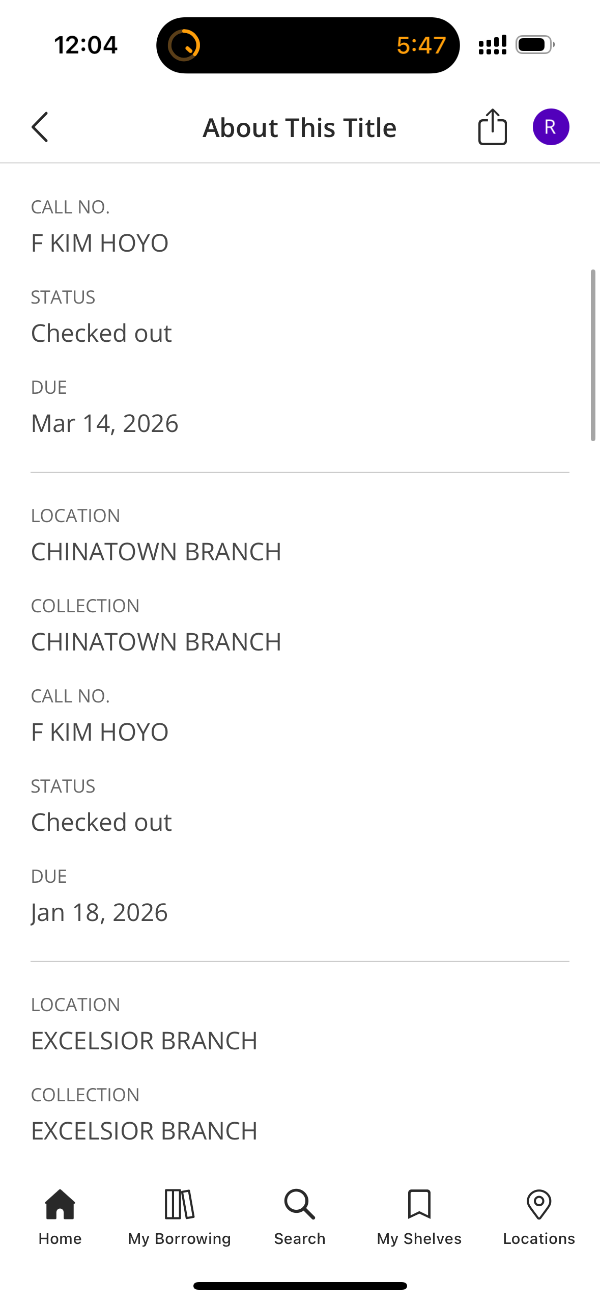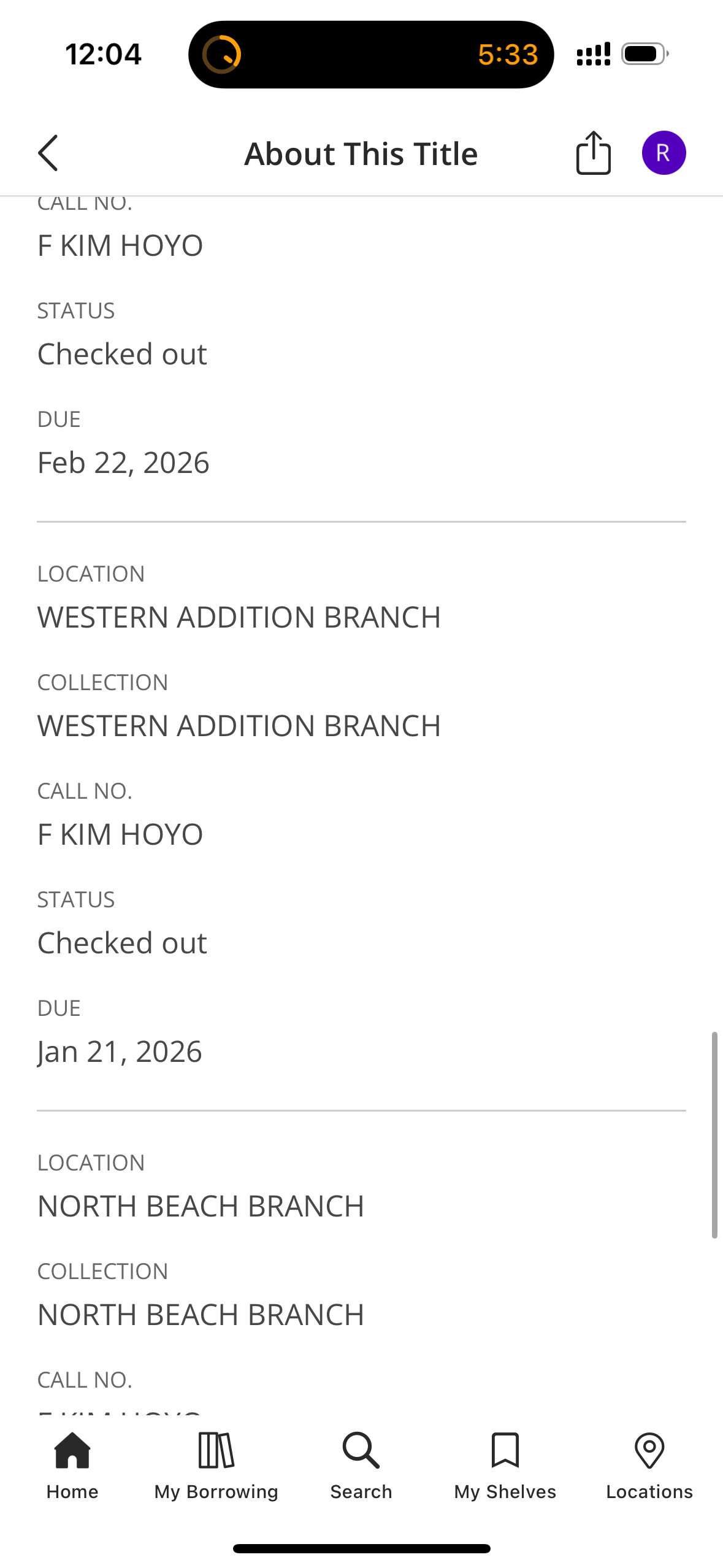 As a side note, the SF public library lets you look at other people’s request holds and the borrowed status of books, so if my book is about to be due back and I’m not done with it yet, I’ll check and see if enough other people have “due back” dates that are before mine; the dream is that enough copies will be returned to cover the requested holds and so my copy will remain free to be renewed. It happens surprisingly often.